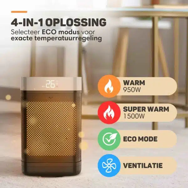 Korte beschrijving: Compacte en krachtige elektrische kachel voor snelle verwarming van ruimtes tot 20 m². Energiezuinig dankzij ECO-modus en instelbare slimme thermostaat — ideaal voor thuis, kantoor of slaapkamer.